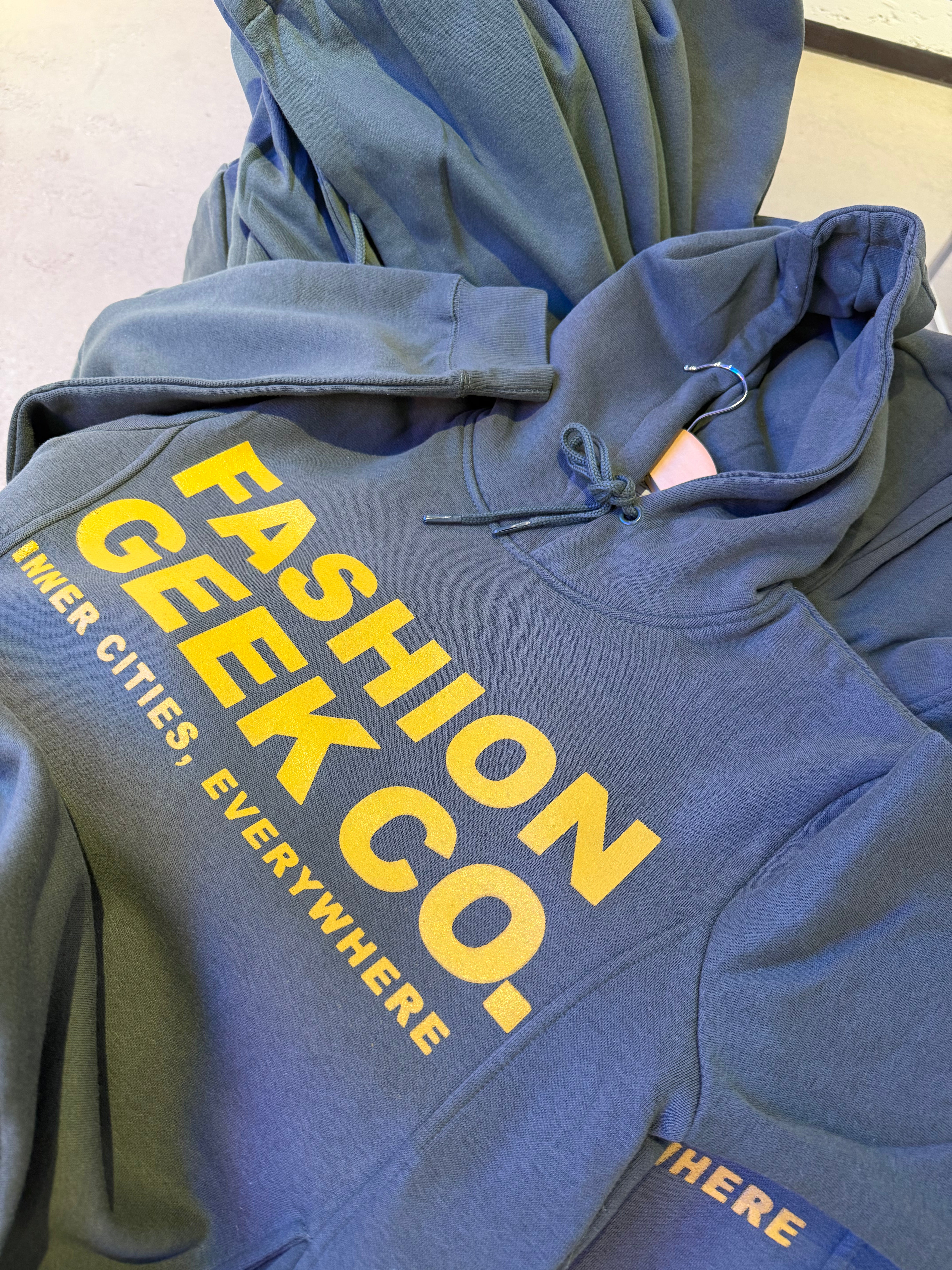 MID WEIGHT HOODIE MILITARY GREEN WITH MUSTARD YELLOW LOGO PRINT .